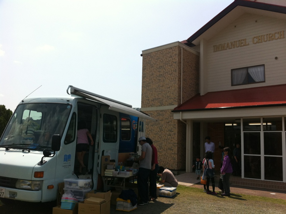 日本基督教団名瀬教会では、商品の半分(とは言っても相当な量)を2階の会堂に運び、陳列させていただきました。(残念ながら名瀬教会の駐車場は会堂下の1階部分で、ゴスペルボックスの高さでは入らなかったのです……)