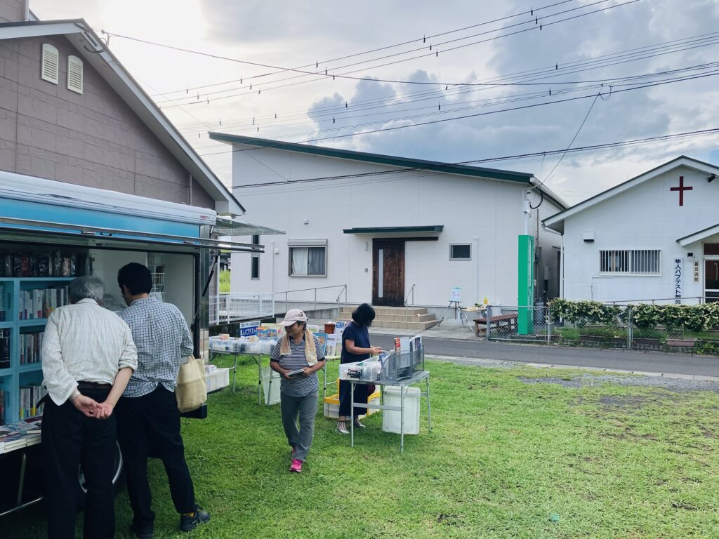 2025年9月17日(水)3.隼人キリスト教会 2025年10月6日 おまけレポート ゴスペルボックスはいよいよ鹿児島県へ入りました。霧島市で宣教に取り組んでおられる隼人キリスト教会へお伺いしました。教会前に広いグリーンの駐車スペースがあり、そこで販売させて頂きました。 通り行く人たちにもお茶やお菓子をご用意