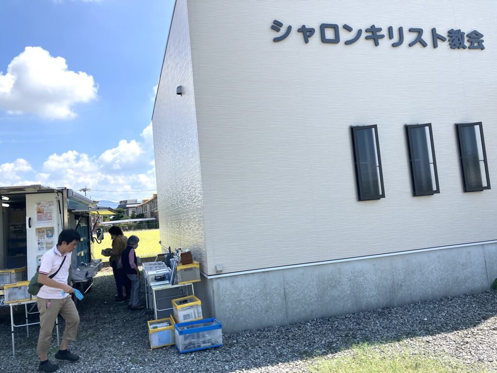 今朝は熊本県八代市で宣教に取り組まれておられる、シャロンキリスト教会へお伺いしました。朝から暑い中でしたが先生がゴスペルボックスを会堂脇の日陰へ誘導して下さり、お買い物をすることが出来ました。八代市は先月、水害と土砂崩れでニュースにもなりましたが、教会玄関が少し高い土台にあり、被害は免れたそうです。教会前に広がる家々は、残念ながら床上浸水だったそうです。