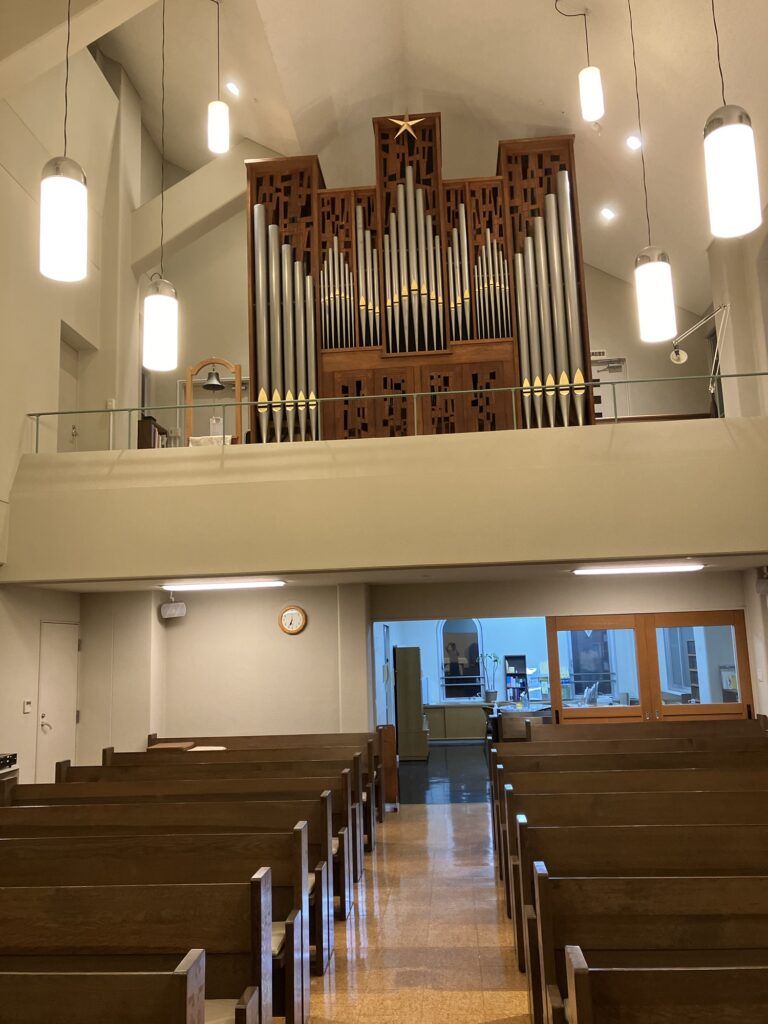 2025年10月3日(金)⑤長崎古町教会2. 2025年10月14日 ゴスペルボックス 激しさを増してきた雨と同時に、機転を効かせた信徒さんが脚立を出してきて、雨に濡れながらブルーシートをかけて下さいました。ありがたいお心遣いと行動力に感謝!どうもありがとうございました。 長崎古町教会礼拝堂のパイプオルガン 販売終了後、先生が教会堂をご案内下さいました。