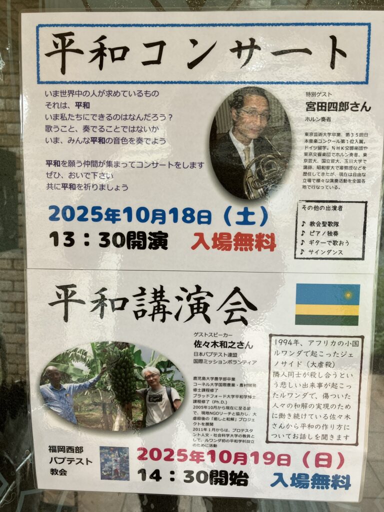 2025年10月18日(土)②福岡西部教会 2025年10月29日 おまけレポート 午後は福岡西部教会のホルン音楽伝道コンサートに合わせてお伺いしました。初めての来会者や久しぶりに来られた方々もおられ、良い集会そしてお買い物の時になりました。 先生ご夫妻の賛美や賛美フラも披露