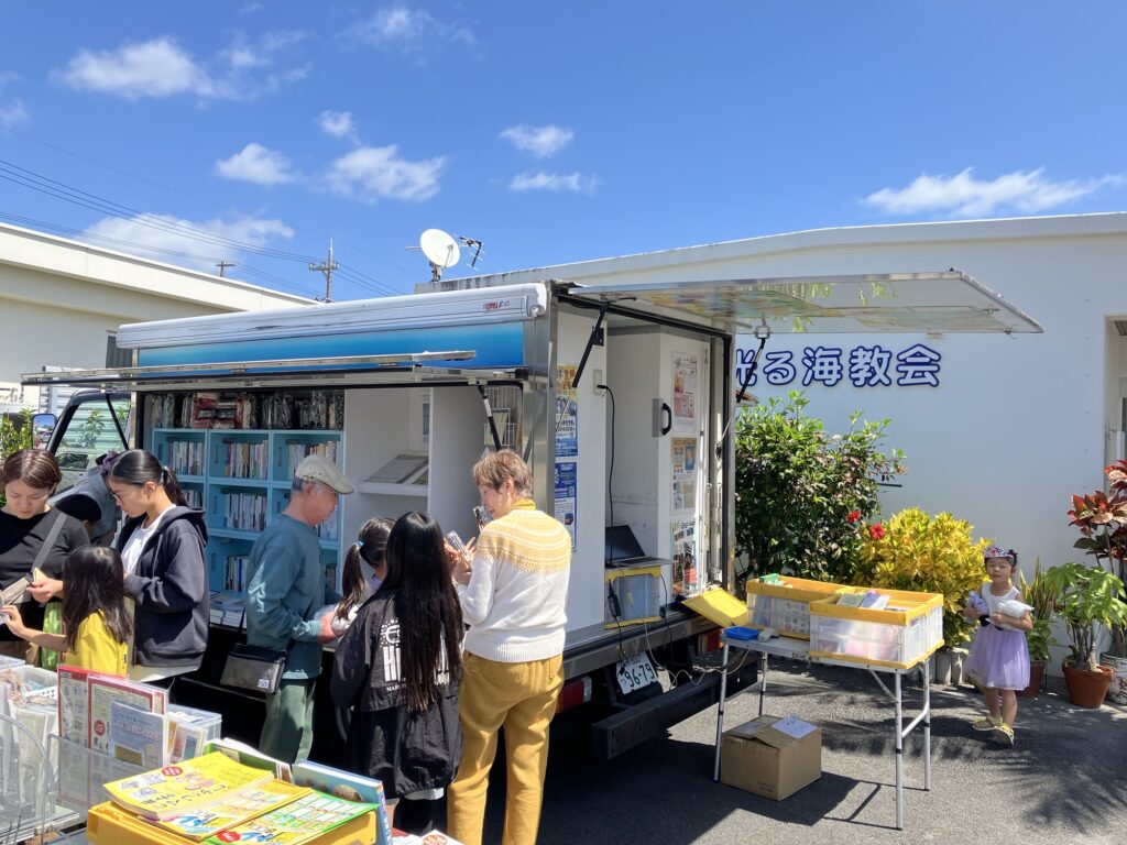 2026年3月15日(日)八重山福音 光る海教会④お買い物も楽しんで。 2026年3月25日 ゴスペルボックス 礼拝が終わり、分かち合いが終わると皆さん次々とゴスペルボックスの周りに集まって下さいました。